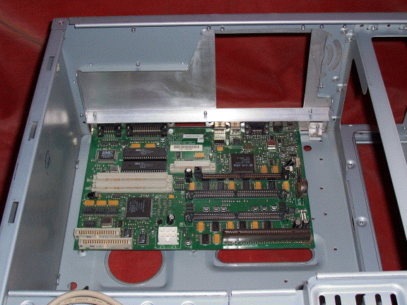 This picture shows an internal view with the motherboard in place. You can see how the section of aluminium angle runs across the back and is riveted to the bottom of the rear plates. This serves three purposes.