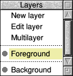 In the menu, the Background layer is below a dotted line. Any layer below this line is said to be in the background and, when the document is printed, objects in background layers are omitted. Items in background layers are shown at half their normal intensity. In other respects background layers are exactly like all other layers. If the layer called Background (or any other background layer) is moved above the dotted line it comes into the foreground and is printed in the normal way. Background layers are valuable for setting out guidelines, grids and comments that are useful when creating the drawing but not needed in finished printouts.