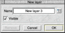 The Edit layer option allows you to change the name and other attributes of the current layer. It opens a dialogue box identical to that shown above except for its title and the availability of the Remove option. Remove destroys the layer and all objects that were in it. Caution ! No warning is given. However, if you inadvertently destroy a layer full of objects in this way the Undo option may reinstate it.