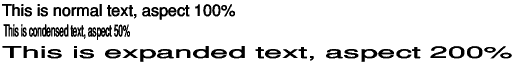 The aspect is the width:height ratio of the text characters and is expressed as a percentage. If the aspect is 50%, the characters will be half the normal width for the current size, so they will appear narrow or condensed, if the aspect is set to 200% they will be twice the normal width or expanded. The following figure illustrates this. You change the aspect in exactly the same way as the size, but the up and down arrows adjust the aspect in steps of 5% and fractions of percentages are not permitted. You can also change the size and aspect of a finished text object using the scaling tool.