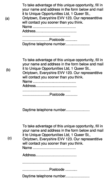 The following illustration shows three stages in the creation of the kind of form that often appears at the foot of advertisements. In (a) the text is in its 'raw' state, just as it was typed at the keyboard. Clearly more space is needed above the dotted lines to give readers sufficient room to enter their details. Estimate where the bottom line will come; select it and move it to that position, as shown in (b). Now select all the lines you wish to space and in the Alignment dialogue box, turn on Top to bottom, select Distribute and Bottom. Also turn on Left to right, select Align and Left (in case in moving the bottom line we moved it to one side slightly).
