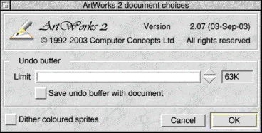 ArtWorks' native format stores all the information relating to your document, including the names and formulations of all colours used and the definitions of all sprites imported into the document, even if they don't actually appear in it. Since it also normally includes the Undo buffer, it may also include details of objects that have been deleted. If you are satisfied that your document is finished and that you will not require to undo any operations, you may save your document without its Undo buffer; this will save disc space. Choose Choices... from the File menu and click on the ArtWorks icon. This opens the dialogue box shown below which controls the maximum size of the Undo buffer. Simply disable the Save buffer with document option and, when you next save the document, the file will not include the undo buffer. Of course, the reloaded document can still be edited in the normal way. You will simply not be able to use the Undo command to step back through operations before the document was saved.