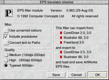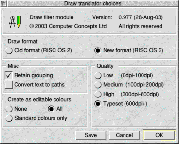 The quality option is only relevant if the ArtWorks drawing contains graded fills or blends. The translation routines convert these to discrete objects in the Draw file, but as they can consume large amounts of disc space, the quality option restricts the numbers of them. If the drawing is to be printed on a low quality printer, probably the number of intermediate objects will make little difference to the printout, so only a few intermediate objects are included. On the other hand, if the file is to be typeset at over 600 dots per inch, there is a benefit to be obtained from including all or most of the intermediate objects. So you can choose the quality level appropriate to the destination printer. Many dot-matrix printers fall into the medium category (100-200 dots per inch) and most laser and ink jet printers into the high category (300-600 dots per inch).