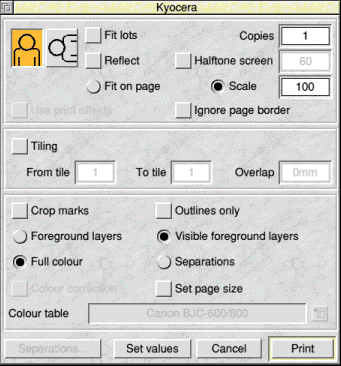 The next panel is concerned with what is printed. By default only visible foreground layers are printed, but you may also choose to print all foreground layers. You can of course make any layer visible or invisible, as you wish. Background layers are never printed, but you can move a layer from the background to the foreground if you wish. See Chapter 6 for further details of layers.
