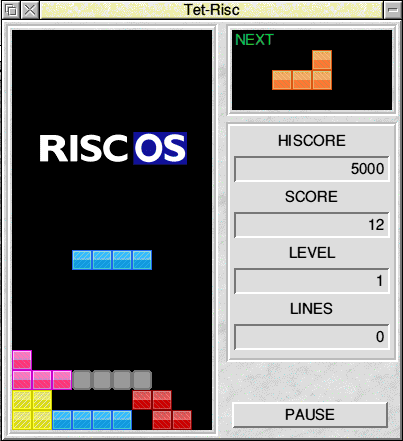 I am very pleased to see such a high calibre game available for the Iyonix , even if it is at a very early stage in development, and hope that updates to deal with the currently known problems become available shortly. In the meantime, may I suggest that you get "fragging". Tet-Risc - Shaun LindsleyWe will finish off this issue's column with a new version of a classic game. A version of Tetris called Tet-Risc designed to run in the RISC OS desktop (should have been called Desk-Risc then - ED!). This is a very nice version, it allows you to change the background image shown behind the falling blocks, as well as choose the type of block from a range of types from popular versions of Tetris produced over the years. ![]() As well as the multiple graphics you can also enable a "ghost piece" so you can see where your block will land. The falling piece can be moved using the cursor keys, the the down key dropping it. You can also rotate the piece using the Z and X keys. Points are awarded as follows: