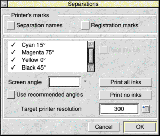 Separation names writes the name of each colour separation, e.g. Magenta, on the printout. In some documents it is obvious which separation is which, but with others, the printer may be left in doubt. Registration marks prints registration targets on each separation. These consist of a circle and a pair of cross hairs. They appear in the same place on each separation and their purpose is to help the printer to set up his press so that the various coloured inks are accurately superimposed on the paper, that is, that they are in register. You should certainly include these in all work that is printed in more than one ink.