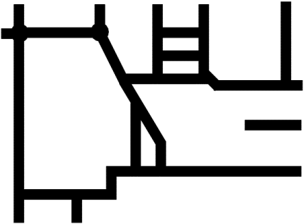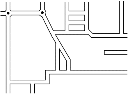 So begin by setting line width-14pt is generally suitable; leave line colour the default black. Select square end style and mitred corners. Create your street plan; grid lock may help if the streets in your town are on a regular grid pattern. When you have finished all the streets, merge the paths using the Join shapes menu option. Next put in any roundabouts. Use the Ellipse facility constrained to a circle; a radius of 14pt (double the street width) looks good and position these carefully over the road junctions concerned. You should now have a recognisable solid street plan like that shown below.