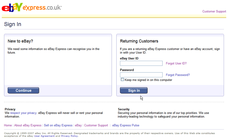 STEP ONE You don’t need to set up a new account for Express. Just use your existing eBay username and password. If you’re already logged into the auction site, you won’t need to sign in again for Express, it will log you in automatically. Interestingly, eBay Express welcomes you with your real name and not your username.
