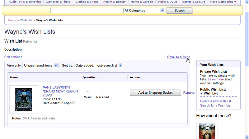 STEP TEN If you have a birthday coming up, or Christmas is approaching, you can create a wish list on the site made up of items you’d like to receive. It’s quite similar to Amazon’s wish list system. When you find something you like, rather than clicking on the Add to Shopping Basket button, click Add to Wish List instead.