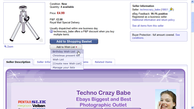 STEP SIX Click on any item to view its details. Sellers all have the usual feedback rating and you can view this in the Seller Information box, as well as the retailer’s returns policy, any additional information on them and other items they are currently selling. You can also click through the tabs to see the same information.
