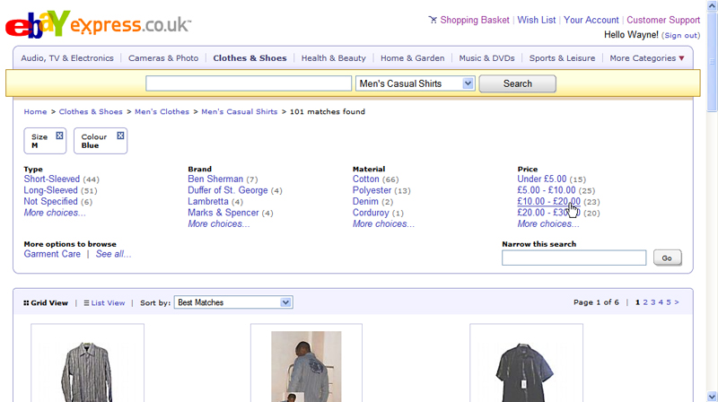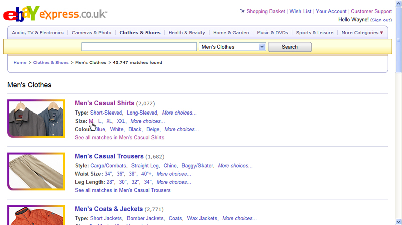 STEP THREE You can also browse through the main categories at the top of the screen. Click one and you’ll be taken to a list of subcategories. To find a men’s shirt, for example, click on Clothes & Shoes, and select Men’s Clothes. You can then go to the main shirts category or click on one of the available subcategories under this. You can look through different types (short or long sleeves), sizes and colours.