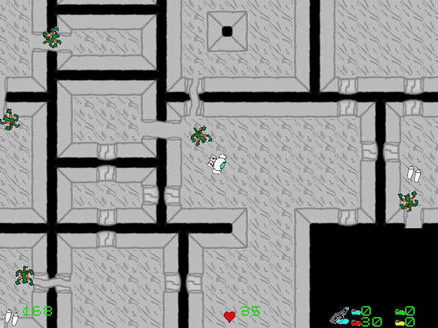 The game involves surviving long enough to find the exit (A black cross on a yellow square). There are different types of ammo to collect, but at present these all seem to do the same amount of damage. In order to oepn the doors to explore the ship you will need to find keys. You will also need to collect oxygen to keep you alive and heart symbols which will replenish your health should you be attacked, and you will.