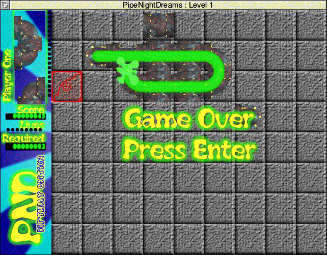 I am sure that you will be familiar with this sort of game. The task is simple. Connect up the two ends of the pipe network before the fluid leaks out. The fluid will start pumping from one of the pipe ends. You must lay a network of pipes to pump the fluid to the exit. You do this by moving your cursor with the cursor keys and placing a pipe segment with the space bar. This will place the currently shown piece of pipe. If this isn't the correct pipe section just keep pressing space until you get the correct one. But you had better be quick as the fluid is getting closer all the time.