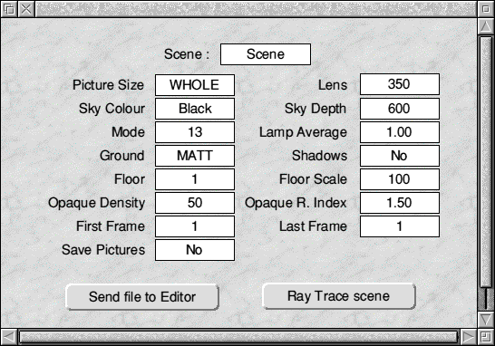 When ray tracing a new set of frames always enter the first and last screen, even if you do not think they will all fit on the disc. If they are not all saved to disc you can then insert a new disc and click on Ray Trace Scene again. The program automatically alters the value of First to be the next picture in the sequence. You continue this process until you have ray traced all of the pictures.