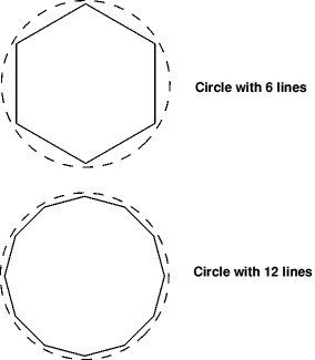 Curved surfaces must be approximated by using a number of small polygons. The more polygons you use, the smoother the object will be. In Figure 2 the difference between using 6 and 12 lines to form a circle is shown clearly. Instead of using lines in 2 dimensions Illusionist uses polygons in 3 dimensions.