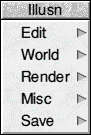 To bring up the main menu press the MENU button on the mouse whilst the pointer is in the Illusionist window. This also has the action of making Illusionist the active program, indicated by the title bar of the Illusionist window turning cream. The main menu looks like this: