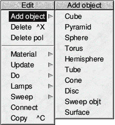 This sub menu enables you to add various objects to the scene. An object is always added with its centre at the cursor position. If the Grid option has been set then the object is scaled to use the grid size. This results in objets falling within a two by two grid. For example a Cube will be exactly two by two grid units and a pyramid will be two units wide at its base and two units high. If the Grid Lock option is on then the objects are locked to the grid intersections.
