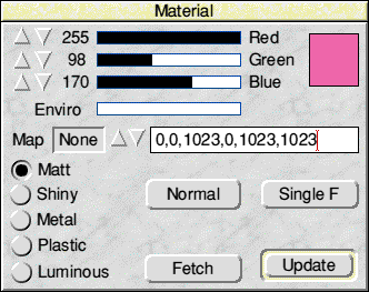 When you enter this dialogue the currently selected colour is shown in the colour box at the top right of the window. (Note: when using 16 colour modes the colour box only shows the nearest colour from its 16 colours.) The sliders at the top of the box are used to alter the Red, Green and Blue components of the colour. You can alter the sliders by dragging or by using the arrows on the left of each slider. Note that changes do not take effect on existing objects unless they are selected and unless you click on Update in this dialogue All new objects created take on the current settings in the Material menu.