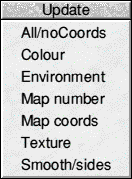 The Update menu is a special form of the Update icon in the Materials menu. It is used to update just the specified item whereas the icon in the Materials menu updates everything, with the exception of map coordinates. The alI/no Co-ords option is the same as the Update icon in the Materials menu.