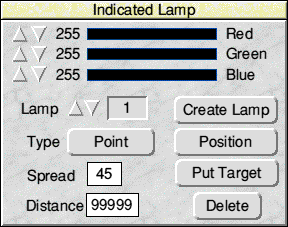 This dialogue controls the lamps, or lights, that are used in a scene. They show on the scene as small grey filled circles with a number beside them. You can have up to 14 lamps in a scene. The colour of the lamp is controlled with the Red, Green and Blue sliders. Any changes take immediate effect.