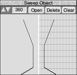 - The left hand icon, set at 360 above, defines the number of degrees of rotation that the sweep makes when the object is created. This is demonstrated later. Clicking on the Up and Down arrows increases and decreases this by preset amounts.