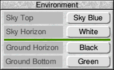 This window enables you to set the colours used in the world's environment. The colours can be selected by clicking on the icons to toggle through the available colours.
