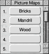 A picture map is any Mode 12 or 13 full screen sprite. Picture maps can only be loaded when this window is on screen. To load a map simply drag it onto the list. Its name then appears in the list with a map number against it. For details on the use of maps see the Edit.Material section earlier in this manual. Utilities such as ChangeFSI or Translator can be used to convert images into Mode 12 or 13 screens.