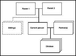 Whereas a person would normally only have two natural parents there could be several marriages and children. To keep the main display as compact as possible children, siblings and spouses are 'stacked' as shown in the simplified diagram. In this diagram the 'Siblings' box is shown dotted, as it will not be present if there are no brothers and sisters. The Parents boxes will always exist, as everyone must have two parents, even if either or both of them are unknown.