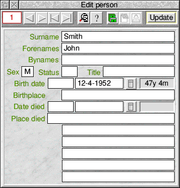 First you will need people to work with. Click the '+' button on the main button bar and the 'Add new person' window will open. The caret will appear in the first field in this window, 'Surname'. Type Smith and press RETURN. The caret will move to the next field, 'Forenames'. Type John and press RETURN again. We shall ignore the 'Bynames' field for the moment, so press RETURN once more to move the caret to the 'Sex' field. Type M for Male, and press RETURN until the caret is in the 'Birth date' field, There are two fields, but for now press RETURN again to bypass the first and move to the second (right hand) field and type 12-4-1952. When this is done and the window looks like the illustration click on 'Add' at the top. If you want to alter any of the fields just click the mouse over the one you want to add to or change so the caret appears there. When you click on 'Add' John Smith's details are entered into the database and he will appear in the main window. You will see that his age is calculated and appears to the right of the 'Date of Birth' field. As we haven't entered a 'Date of Death' he is assumed to be still alive.