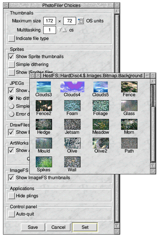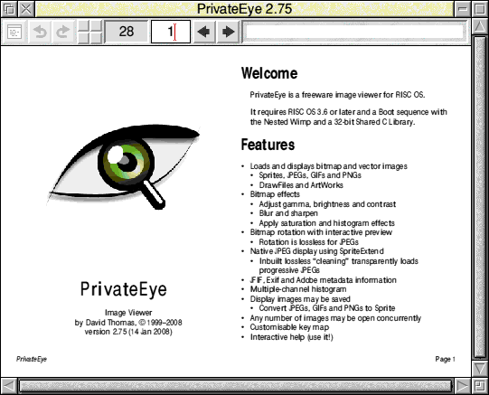 PD WorldPaul Brett with the latest freeware and PD releases for RISC OS. We have all had a very pleasant surprise this month. You may have missed this particular announcement, if you did then I am pleased to tell you that Peter Nualls has kindly released a new and updated version of FireFox for RISC OS. FireFox - Unix Porting Project/Peter NaullsThis is new release of the Firefox browser for RISC OS machines. It's only suitable for the Iyonix, A9 and StrongArm VirtualRPCs. FireFox won't work on normal StrongARM RiscPCs as these machine have a bug in the memory controller which means that half word instructions are not correctly handled. Peter has addressed this problem and has also produced a version for "normal" RiscPCs and the non-StrongARM VirtualAcorns. So make sure you run the correct version or it won't work. ![]() FireFox I am especially delighted to see this new release, particularly as it appeared "out of the blue" with no prior notification that Peter was working on it. Many people in the RISC OS community seemed to have given up on FireFox (me included - ED) and it did look as though there were not going to be any more update. Since we do now have this new version what are the improvements? This new release is based on the FireFox 2.0.0.12 version. Previous RISC OS ports were based on version 2.0.0.1. Peter has spent his time in dealing with some of annoyances suffered by some users. The bug that caused FireFox to fail to start on some machines (like mine - ED) have now been resolved. FireFox now quits correctly from its icon bar menu, the problem of some window panes vanishing for no apparent reason has also been tracked down and corrected. Other improvements relate to bookmark handling, security settings and the removal of the strange tiny window that appeared on some machines. There have also been some interesting "under the hood" changes. This new FireFox no longer uses the !UnixHome application to store its choices, nor does it need the ELFLoader. it has also been compiled with GCC 4.1 and then converted to AOF format using a new tool that Peter hasn't yet disclosed. Peter is still looking for people in the RISC OS community to contribute towards the FireFox port and to other projects. You can get more information from /www.riscos.info/index.php/Donations. Donations don't have to be in monetary terms, Peter says that there are plenty of projects that just need someone, with some spare time, to work on them. Regrettably I haven't been able to include a screenshot as (at the time of writing) I have not been able to get either version to work. (Neither have I, I've tried both the normal and RiscPC versions on different VirtualRPCs with no success. I am going to e-mail Peter the STDRR file - ED). PhotoFiler - Dave ThomasPhotoFiler is an extension to the RISC OS Filer which adds an image thumbnailing facility similar to that provided by RISC OS Adjust and RISC OS Six. With PhotoFiler loaded, the file type icons for Sprites, DrawFiles, JPEGs and ArtWorks are replaced with miniature versions of the particular image. PhotoFiler can also be used with a copy of ImageFS to provide thumbnails for a much greater range of file formats, including WMF files. PhotoFiler was previously sold by Warm Silence Software. but has now been made freeware by Dave Thomas who wrote it. PhotoFiler is an absolute boon on the Iyonix, as RISC OS 5 does not have the image file thumbnailing options offered by the RISCOS Ltd. branch of the OS. ![]() PhotoFiler To use PhotoFiler just double click on it to launch the icon onto the iconbar. From here you can open the Choices window with a single Select click. PhotFiler integrates seamlesly with the normal RISC OS filer and should work with any filing system. You can read the full help text by clicking on the Help option over a copy of PhotoFiler in a filer window. Printer Drivers - Jonathan Briggs and RISC OS ConnectRISC OS Connect have just announced that the range of printer drivers developed over the years by Jonathan Briggs can now be downloaded from the RISC OS Connect website. These drivers have been in development for a number of years and support high resolution printing on a range of both Epson and Canon printers. If you have one of the supported printers then these drivers will offer far better quality than the standard RISC OS drivers. ![]() Printer Drivers Jonathan's drivers have been available for a number of years, typically dropping him an e-mail would be enough to get you the appropriate driver for your particular printer. However the world has moved on and with Jonathan not having the time to support the drivers any more it was decided that they should be made available and placed into the public domain. I have included the full set of drivers in the software section of this CD. Parmesan V 1.30 - Christian LudlamChristian recently released an updated version of his "cheesy" MSN client for RISC OS. If you are using an earlier version then you should upgrade to this one as it has bug fixes and new features. One of the main new features is a popup alert window that will tell you when a new message is received, you can even assign a sound effect to the window as an audible notification. As a bit of fun Parmesan can also read out the text of any message you receive using Jonathan Duddington's eSpeak (formerly Speak) module. ![]() Parmesan Parmesan is an Instant Messaging client for RISC OS. It allows you to "talk" to other people on the MSN network by sending short text messages to each other. These message can include small pictures (called emoticons) to express your emotions, rather like a smilie in an e-mail. Parmesan can also act as a system for transferring files between two or more people. Parmesan is a great instant messaging client and I wholeheartedly recommend it. PrivateEye V 2.75 - Dave ThomasThis is our second offering from Dave Thomas. PrivateEye is an image viewer for RISC OS. It allows you to view all standard RISC OS filetypes, suc