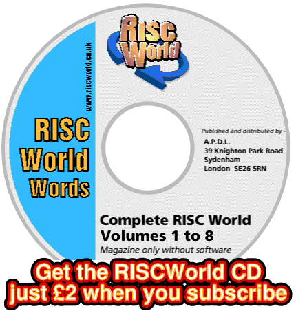 Complete CD subscription £26.90 UK (£29.50 overseas)A years collection of six RISCWorld CDs for £26.90 in the UK and £29.50 overseas, plus an updated copy of the "Just the Words" CD. ![]() The Complete RISCWorld CD