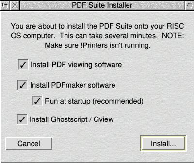 Matt Thompson ![]() PDFSuite is a brand new release from RComp. I have to admit that having placed my order it wasn't quite what I was expecting. I assumed it would a main application with some freebie support software thrown in, however it's not quite that after all, the name PDFSuite is a bit of a giveaway really, in that this is a suite of programs which are all related to the use of PDF files on RISC OS. For those that don't know PDF stands for Portable Document Format, you may know PDF better as "Acrobat" as they are the same thing. The principle is to provide a highly compressed document that can be viewed and printed on any machine and that will always look the same regardless of the platform it's viewed on. PDFSuite allows you to view existing PDF files and to produce your own PDF files on RISC OS. Installation