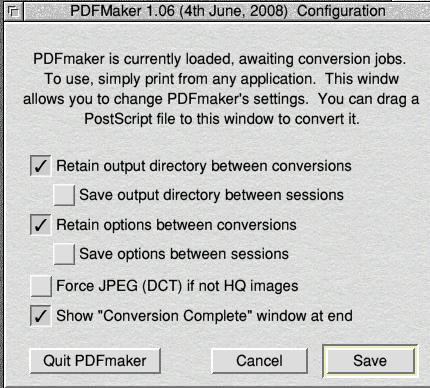 Now we are ready to begin the installation, double clicking on !PDFInst, brings up the following dialogue: ![]() The PDFsuite installation window This is pretty much self explanatory, so click on install and after a few minutes the suite of programs will be installed on your hard disc. At first it looks like nothing has happened, which is what I thought, as there are no obvious new program icons anywhere, but after a machine reboot you will see some new things. There is now a directory called Printing on the hard disc which contain the RISC OS printing applications, !Fontprint, !PrintEdit, !Printers and the new program !PDFmaker, which we will look at in a minute. Another new addition on the hard disc is a directory called 'PtrBackUp' this is a backup of your printers configuration, which is provided just in case anything goes wrong during the installation. Let's return to the main !PDFmaker application. If you double click on it a configuration panel will appear, which allows you to configuration PDFmaker's settings. PDFmaker will be running all the time in the background until you click on the 'Quit PDFmaker', all self explanatory really. ![]() The PDFsuite configuration window So now that the PDF suite fully installed into your computer, you may be wondering what has been installed and where it has been put: