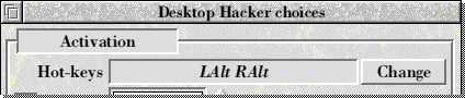 Choose 'Choices...' from the icon bar menu and click on the Change button to change the hot-key combination. Hold down the combination of keys you want to use to activate Desktop Hacker; up to four keys can be used together.