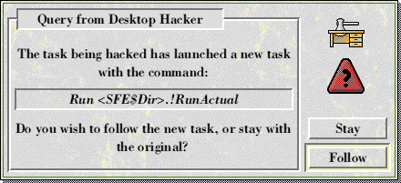 If you click on 'Stay', Desktop Hacker will ignore the new task and continue with the existing one. On some versions of the WIMP, this may sometimes not work and cause Desktop Hacker to follow no task at all, due to the odd way Wimp_StartTask works. So it's usually best not to choose 'Stay'.