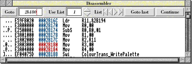 Choose a list in the 'Use list' field and all the visible addresses included in that list will be highlighted in red, as above. If you click on the address with Adjust, the address will be toggled in or out of the list. Use the List arrows next to the List selector to move the disassembler through addresses in the list: the inner arrows move through the addresses one by one, and the outer arrows move to the first and last addresses in the list.
