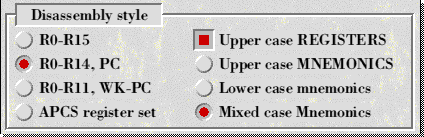 On the right, the case of the disassembled instructions can be set to your own personal style. Upper and lower case mnemonics and registers may be set separately; there is also a mixed case mnemonics option, wherein the only the first letters of mnemonics, condition codes and flags are capitalised. I like this, but some people think it is evil. S'what options are for, innit?