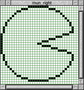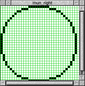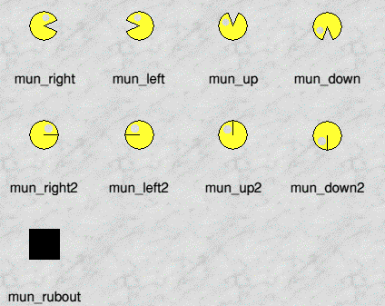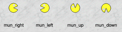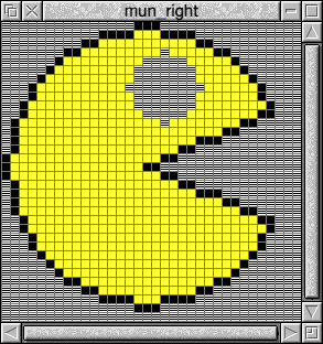 Before we go any further, look at the colours in the 'colours' window. You will see that they have eight shades of grey and the various other colours of the desktop, together with an extra box which represents the sprite's mask. Remember that we won't be using our sprite in a desktop display, but in a normal mode, either 27 or 12, and we saw its colours in Section 6. If we design our sprite using the colours we have here, it will look all wrong when we plot it. When we set the colour of a pixel, we simply give it a number. All we have to do is change the colours in our display to be the same as the ones in the mode which we'll be using and all will be well. Click Menu on the sprite file window and go to the 'Display' submenu. You'll see an option called Use desktop colours which has a tick. Clicking on this will turn off the tick, and close the window if you used Select. At the same time, the colours will change. They still won't look right if you're in a sixteen colour mode, though, because this mode can't show the colours we want as well as all those of the rest of the desktop at the same time. The solution is to change to a 256 colour screen mode. You should now have two identical sets of colours. The white square in the sprite window will appear to have vanished, leaving just an outline, because it's in colour 0 and colour 0 has just changed from white to black. Drawing the OutlineBefore setting to work on the sprite, you'll need to enlarge the work area so that you can easily select individual pixels. Click Menu over the sprite window, go to the 'Zoom' submenu and enlarge the black sprite in the window to 8 times its normal size. There is a grid over it, so that you can see the individual pixels, but you probably won't be able to see it at first, because it is also black! Go to the Grid submenu and turn it green. The small rectangles you can see are the pixels. If you are in mode 12, they will be twice as high as they are wide; if you are in a square pixel mode, such as mode 27, they will be square.Because we are going to start by drawing black lines, the first thing to do is turn all the pixels white again. Go to the 'tools' window and choose Replace colour - it doesn't matter here whether you use local or global - then choose white in the 'colours' window and click on any pixel in the sprite window. All the pixels will turn white. The next thing we need is a black circle. Choose Circle outlines and black. then draw a circle filling the sprite, like this: ![]() We're going to need this circle again later, so we need to keep a copy of it in its present form. Click Menu over the sprite in the sprite file window, go to the Sprite 'mun_right' submenu and use the copy option to make a copy of it called, say, 'mun_x'. The next step is to draw an open mouth. Use the Set/clear pixels option to remove the straight line down the right-hand side of the circle by turning its pixels white, then draw a black 'v' shape, like this: ![]() You can now use the Replace colour - Local option to turn the space inside the shape yellow and the surrounding area the mask colour. Finally, give your creation an 'eye', which can either be a colour or a section of mask, so that it looks like this: ![]() You now have something worth saving, so save the sprite file with the filename 'MunSprites'. We now have a sprite showing our character facing right. As we will want to move him in all directions, we'll need three more sprites showing him facing left, up and down. You made a copy of the sprite earlier, when it was just a circle. Do the same thing again with the completed sprite, calling this copy 'mun_left'. To make the copy face in the opposite direction, double-click Select on it to open its sprite window, open a menu on the window, go to Edit and choose Flip horizontally. This will turn the sprite round and you can close the sprite window again and resave the file. Completing your First Four SpritesYou could create two more sprites, with the character facing up and down, by rotating the one you already have through 90 degrees, but it may not look very good, especially if you are using mode 12. As the pixels aren't square, RISC OS has to create one pixel out of two in some places and two pixels from one in others. An alternative method is to copy the 'mun_x' sprite that you saved when it was just a plain circle and create a new sprite from that one. You can create a character with a mouth at the top, called 'mun_up', and flip it vertically to create 'mun_down'. You should now have four sprites that look like this:![]() So far, so good, but we don't want our character to wander around the screen with his mouth gawping open all the time. He really needs to open and close it as he goes, so that he appears to be gobbling things up! This means that we need yet another four sprites with their mouths closed. Fortunately these are easier to draw. Go back to your circle, make a copy called 'mun_right2' and draw a black line from a little to the right of the centre out to the right-hand side of the circle. Colour the space inside the circle yellow and give it an eye as before. Make a copy, flipped horizontally, called 'mun_left2' and repeat the procedure for 'mun_up2' and 'mun_down2'. Before you finish this exercise, there is one more job to do. We need a sprite to draw over our character to rub it out when we move it. Open the menu on the sprite file window, go to New sprite and create a sprite the same size as your existing ones called 'mun_rubout'. This is just a completely black sprite without a mask or palette. Your sprite file window should now look like this: ![]() Save your sprite file for the last time and close down Paint. We're ready to start looking at the program. The Munchie ListingThe first program will concentrate on moving our character around the screen. We won't list it in one piece but you can see the whole thing by looking at the file.