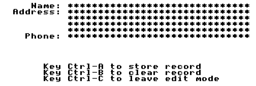 This procedure prints the record number in the top left-hand corner of the screen, adding 1 to it so that the records appear to be numbered from 1, not 0. It then prints the name of each label in turn. The rather complicated-looking TAB statement has the effect of right-justifying the label. This means that its horizontal position is adjusted so that the right-hand character is 23 positions in from the left-hand side of the screen, however long the label is. This is purely to improve the appearance of the screen. When the array which holds the labels, label$(), is created in PROCinit, each element in it is set to the null string, that is zero characters in length. If you don't define a particular label in PROCset_labels, it stays like this and PROClabels doesn't print anything for that line. ![]() The standard layout used by this program has each field appearing on the screen 25 characters in from the left, and the first field, number 1, 20 lines down from the top (10 in mode 12). This means that any particular field is on row 19 (or 9) plus the field number. This is important, because PROCupdate, which we'll get to later, uses the position of the cursor to work out which character in a field to alter. Seeing StarsAfter printing the labels, PROCedit calls PROCstars which prints a rectangle of stars, one for each character of each field. This is to show you the maximum number of characters you can type into each field. This is important because the fields all have to be exactly the correct length so the program knows where to find them in the file. It doesn't matter how short the text in a field is as the rest of the field is filled with spaces.Returning to PROCedit, after printing a message on the bottom of the screen telling you which keys to press, we look at the number which was passed as a parameter when PROCedit was called, which is now local variable x%. If this is zero, indicating that we're editing a newly-created record, we clear all the fields. PROCedit_clear does this by setting each element of the array field$() to a string of spaces, one for each character in the field. If x% is 1, PROCedit is being used to edit an existing record so we want to display the data in its fields. We don't want to dispense with the stars completely, though, because they show us how many characters we could add to a field, so we print each field over the top of the stars, leaving the ones at the end of each line untouched. This is done by using FNtrunc which removes the excess spaces from the end of each field string. Suppose, for example, you had a name consisting of 25 characters. Unless you've modified the program, each field has a length of 30 characters, which means that PROCstars has put 30 stars on each line. It also means that field$(1) is 30 characters long. The first 25 contain the name and the last five are spaces. FNtrunc removes these spaces and produces a string 25 characters long containing just the name. When you print this string, the first 25 stars are over-written and the remaining five left untouched. It may seem unnecessary to use a CASE ... OF structure to handle the various values of x% as there are only two options and we could easily use IF ... THEN instead. Doing it this way makes it easier for you to add other options to use PROCedit in different ways. ![]() ... the first 25 stars are over-written ...